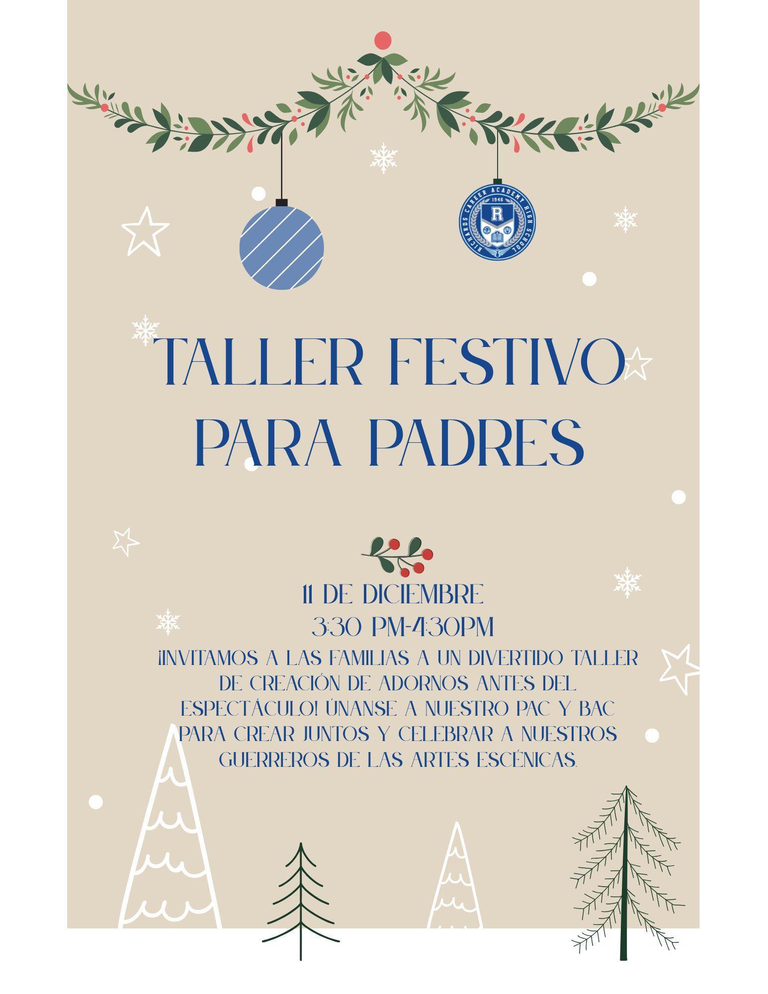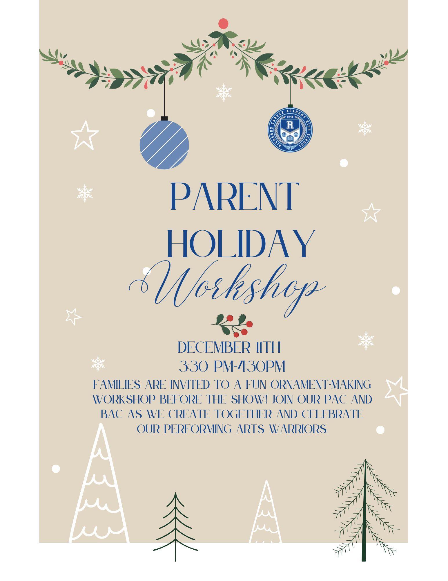 Se invita a los padres este jueves 11 de diciembre a las 3:30 p. m. (BAC) y a las 4:00 p. m. (PAC) a una divertida tarde de comunidad, comida y un taller de creación de adornos para familias. ¡Vengan a crear, conectar y celebrar juntos!
