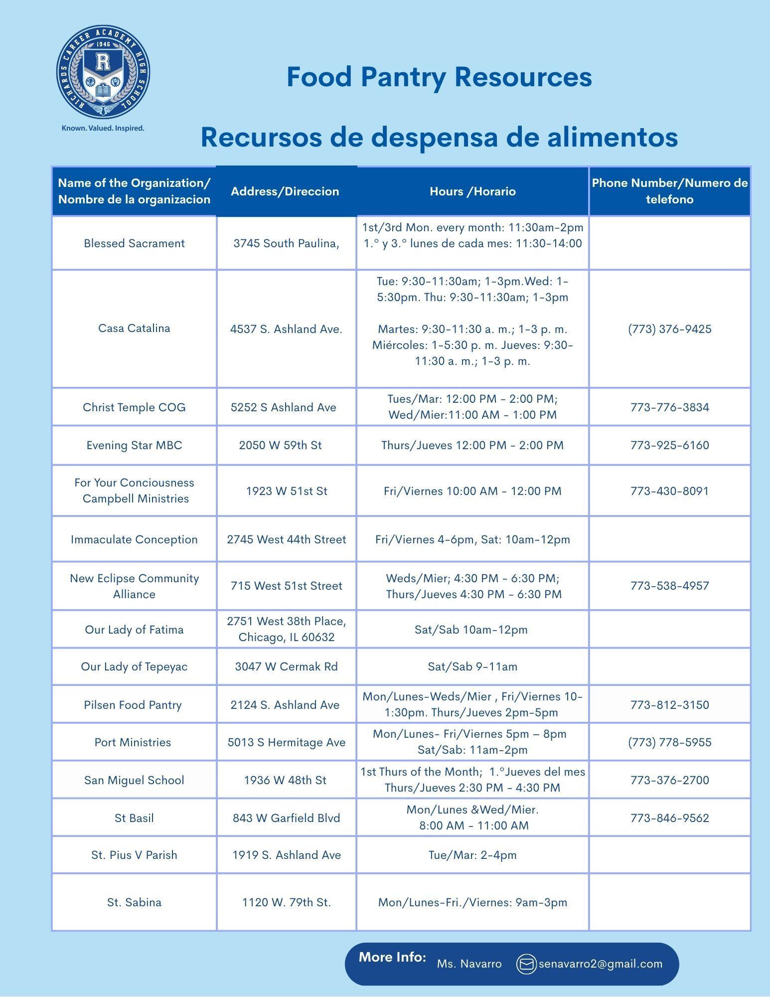 Visite We Got You Illinois para obtener una lista completa de los bancos de alimentos y programas de comidas en Chicago y el condado de Cook. El gobernador Pritzker ha añadido recientemente 20 millones de dólares en ayudas para el acceso a alimentos. ¿Necesita ayuda para encontrar opciones? Llame a la línea directa Healthy Kids: (773) 553-KIDS.