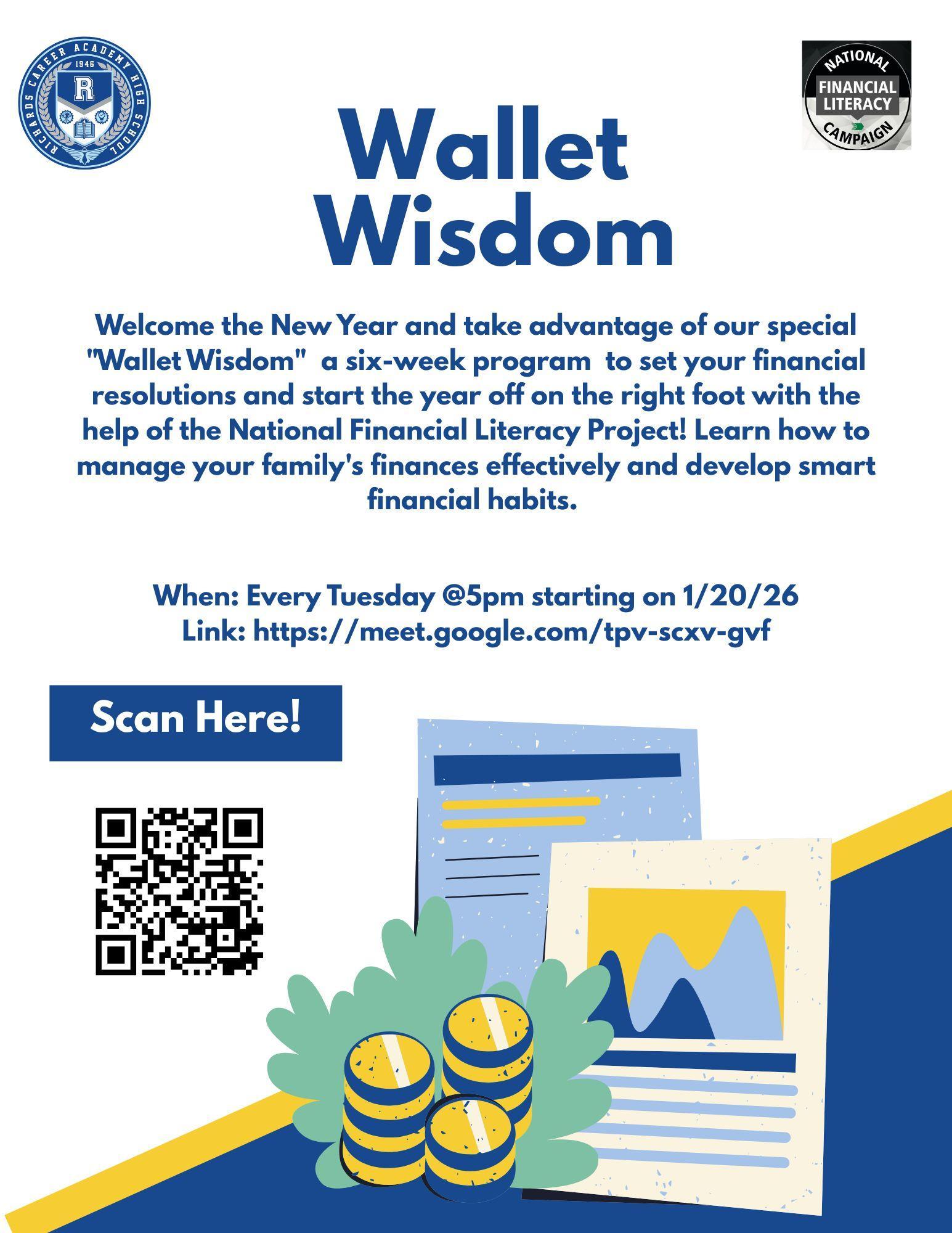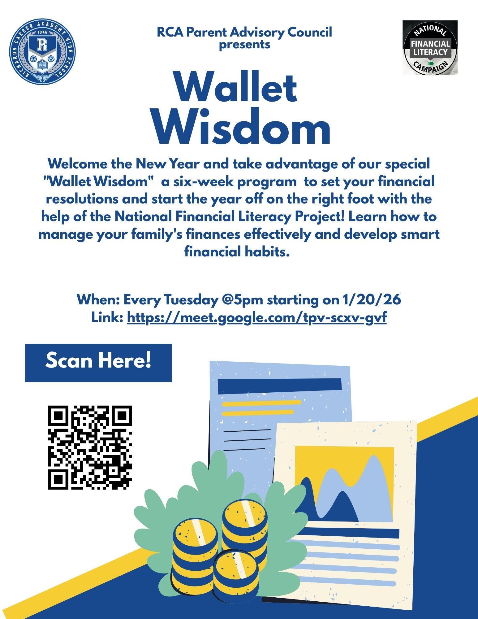 Welcome the New Year and take advantage of our special "Wallet Wisdom" a six-week program to set your financial resolutions and start the year off on the right foot with the help of the National Financial Literacy Project! Learn how to manage your family's finances effectively and develop smart financial habits. This program will be in english and held virtually every Tuesday starting January 20th @ 5pm.