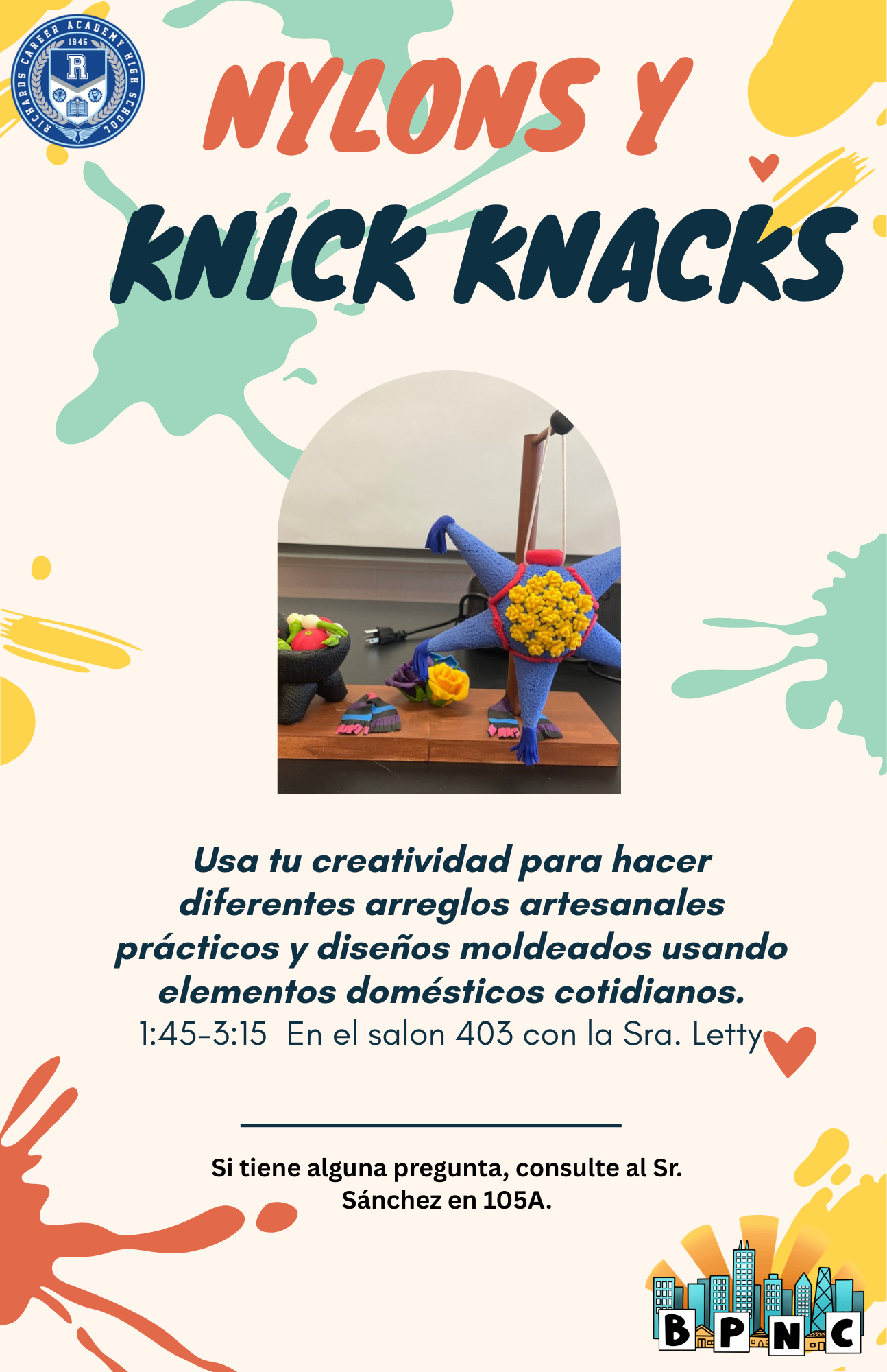 Nylons and Knick-Knacks club is seeking students/El club Nylons and Knick-Knacks busca estudiantes.