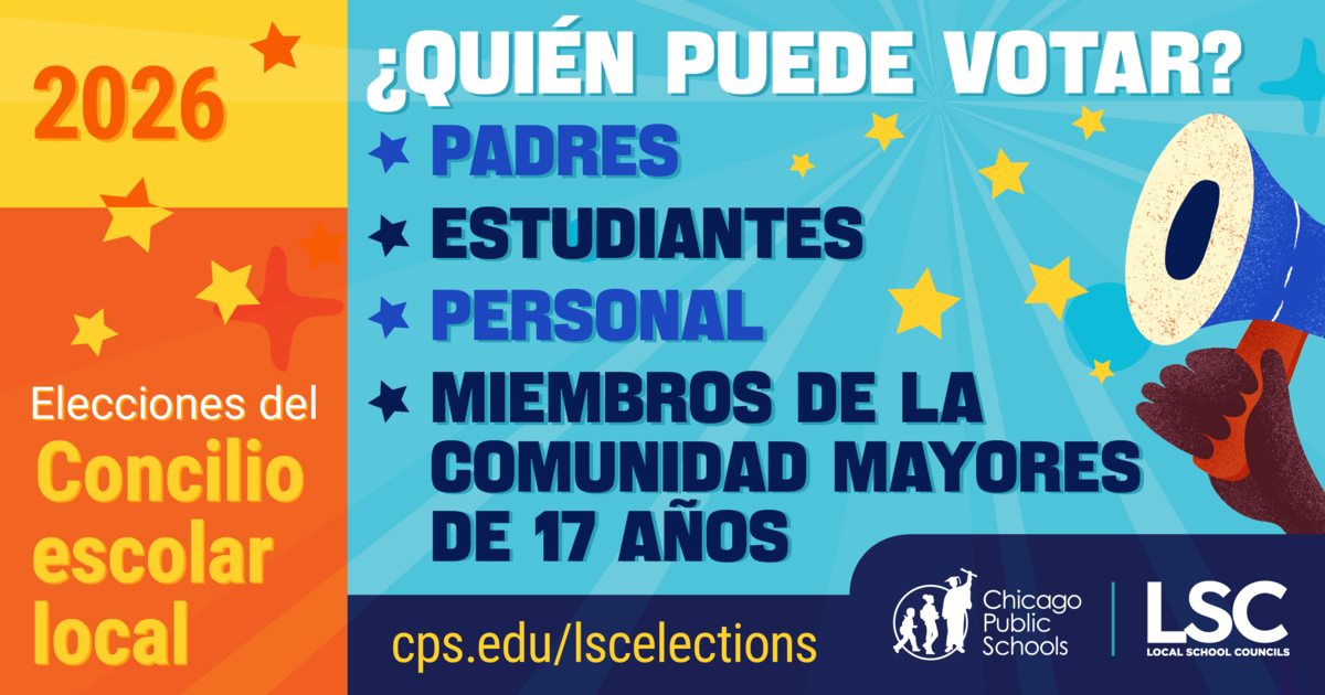 Invitamos a padres y tutores a participar en las Elecciones del Concilio Escolar Local (LSC) el miércoles 18 de marzo. Las votaciones se llevarán a cabo durante las conferencias de padres y maestros de 12:00 PM a 6:00 PM.